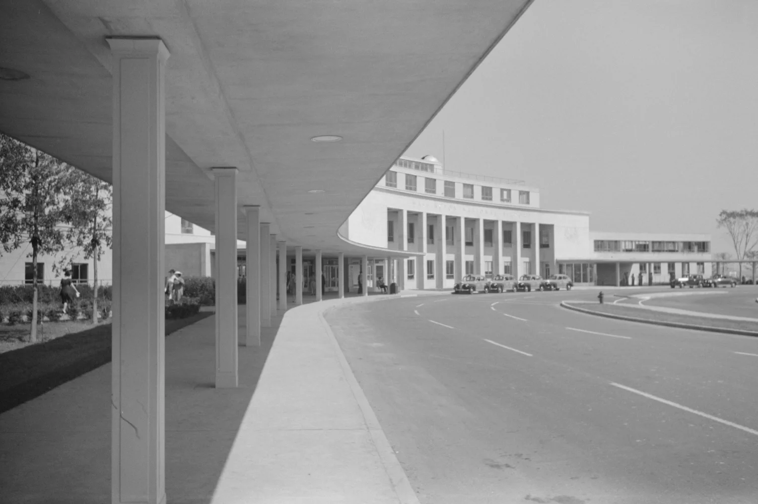 Ronald Reagan Washington National Airport as it was on opening in 1941, long before Reagan's name had been added. The facade of historic Terminal A looks today much as it does then, a monument to a bygone era when air travel was a more glamorous affair of fancy hats and suits. DCA was listed on the National Register of Historic Places in 1997.